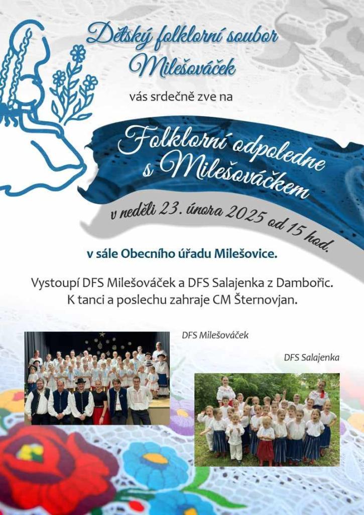 Dětský folklorní soubor Milešováček vás srdečně zve na Folklorní odpoledne v neděli 23. února 2025 v 15.00 hod. v sále OÚ Milešovice.